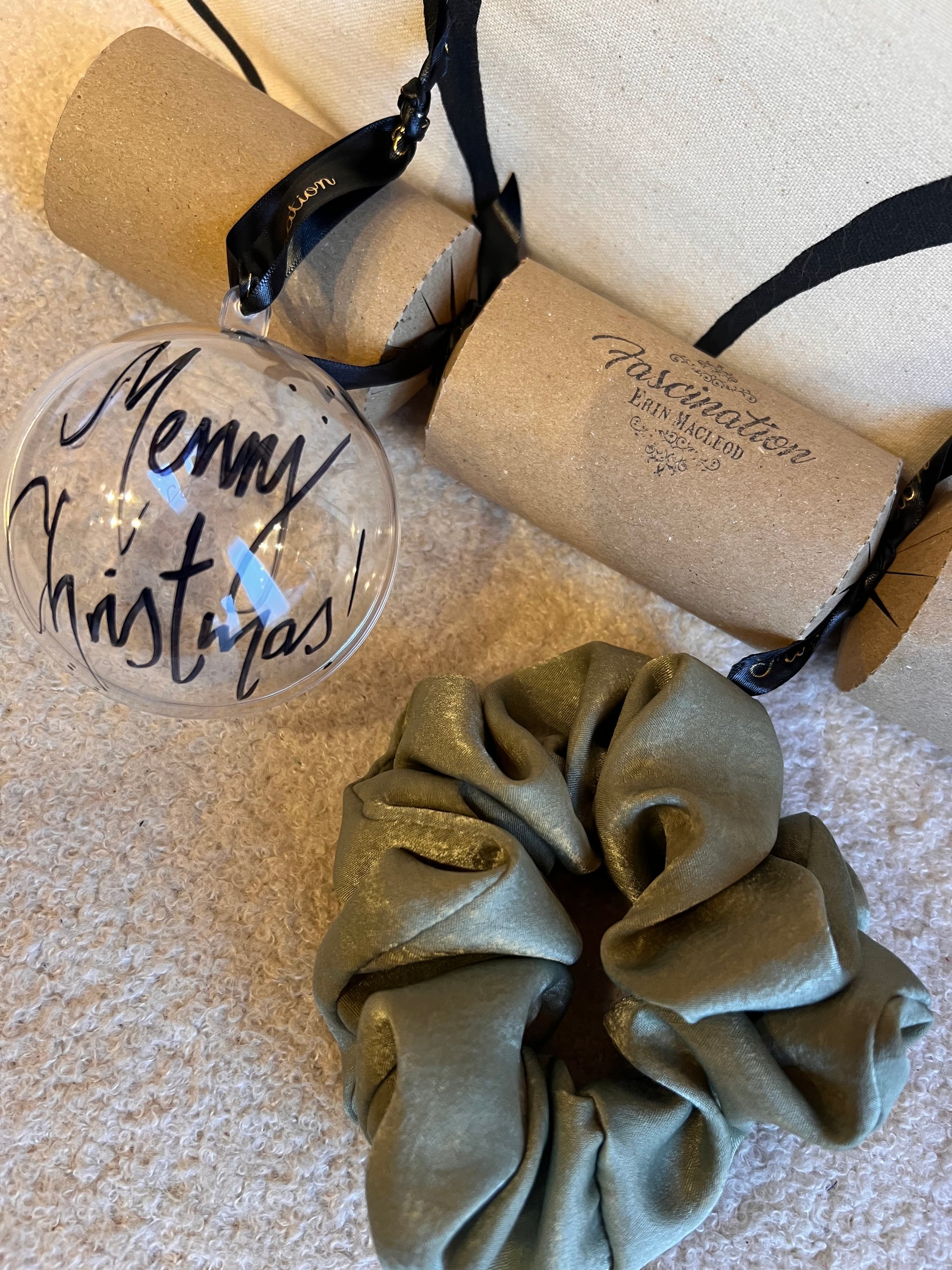 Introducing Scrunchie Crackers & Baubles! Perfect for Secret Santa gifts or hanging on the tree, these fab packages include our classic fascination scrunchie. Embrace the festive season with these stylish and practical accessories. A must-have for any fashion-forward individual.